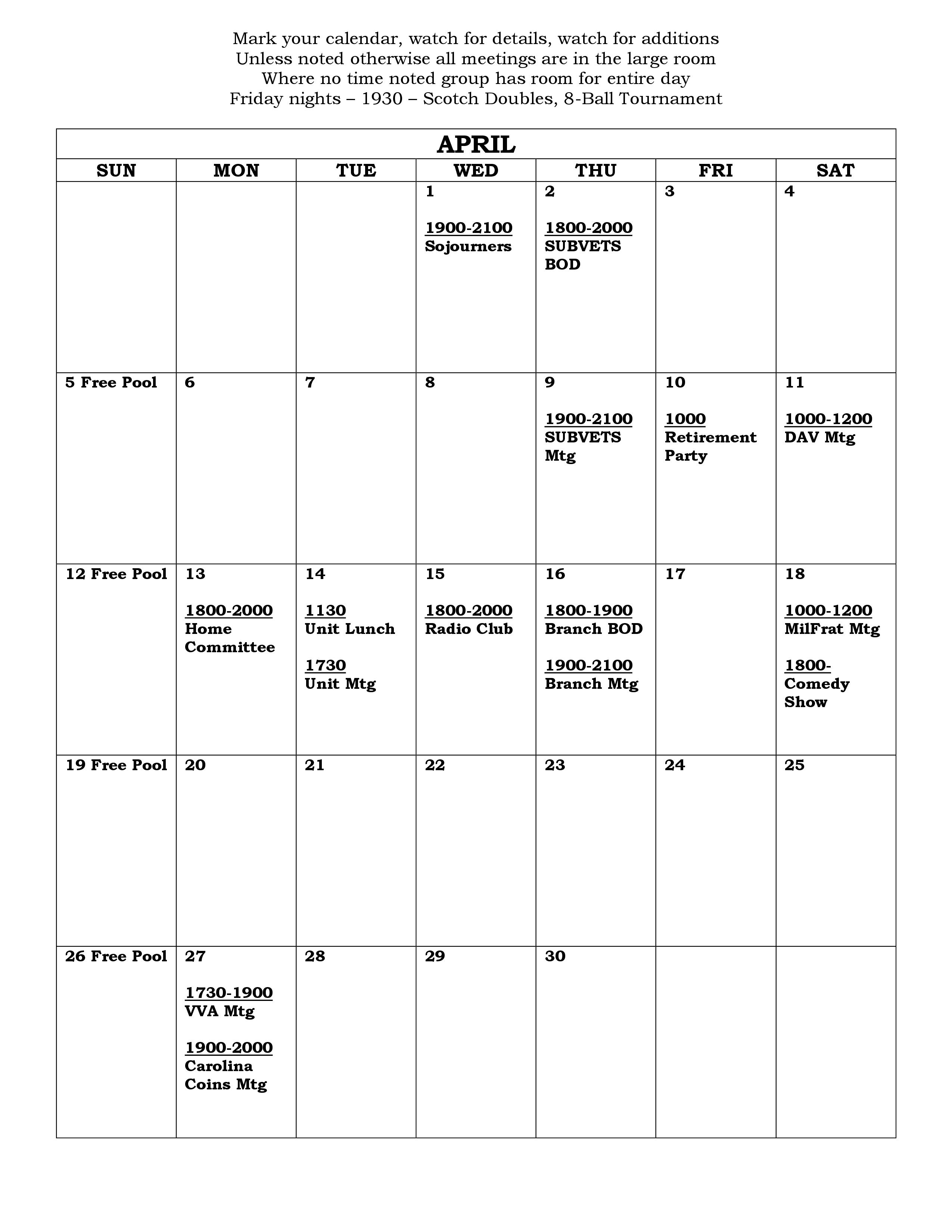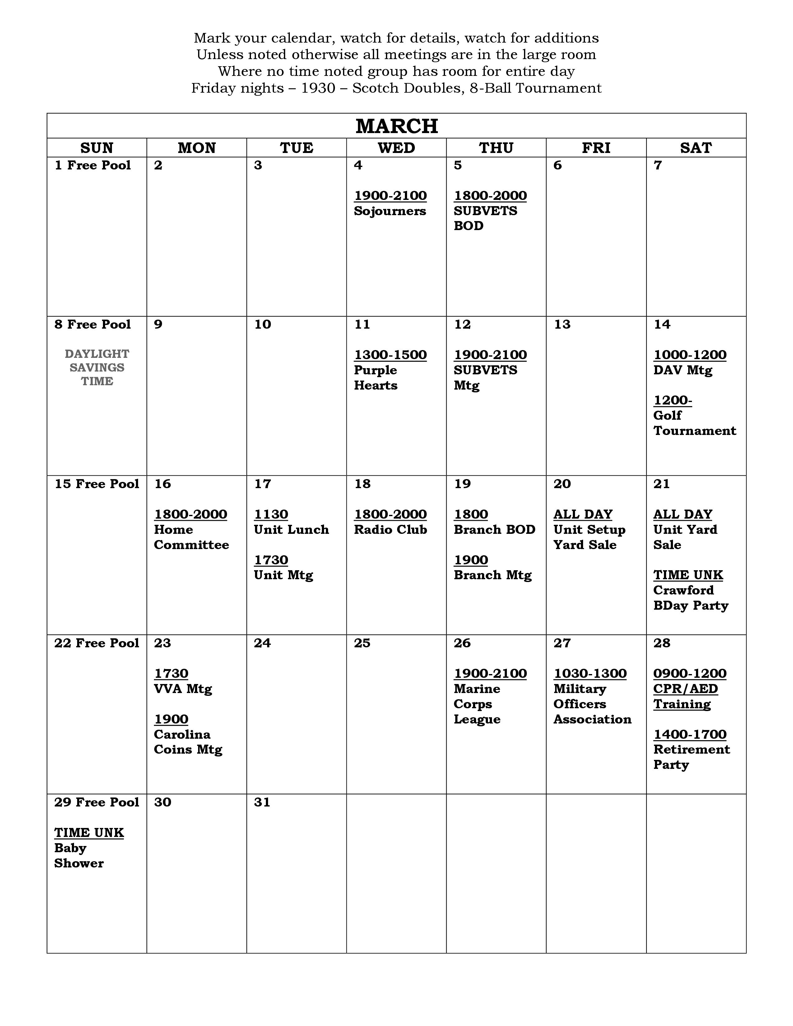 UPCOMING EVENTS Monthly Calendar